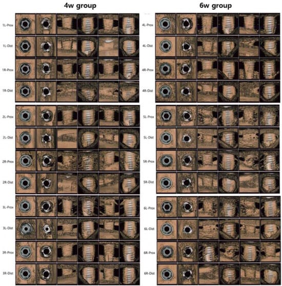 Micro-CT data for 12 implants. 1R-Prox, 2R-Prox, 3R-Prox, 1L-Dist, 2L-Dist, 3L-Dist, 4R-Prox, 5R-Prox, 6R-Prox, 4L-Dist, 5L-Dist, and 6L-Dist are in the FEMTO group; whereas 1L-Prox, 2L-Prox, 3L-Prox, 1R-Dist, 2R-Dist, 3R-Dist, 4L-Prox, 5L-Prox, 6L-Prox, 4R-Dist, 5R-Dist, and 6R-Dist are in the SLA group. dist, distal; FEMTO, femtosecond laser; L, left; prox, proximal; R, right; SLA, SLA, sandblasted, large-grit, acid-etched; W, week.
