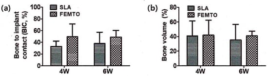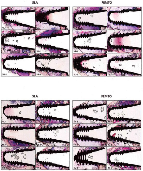 At Week 6 after implant placement, the FEMTO group had 24.25 ± 8.95% bone within the analysis range, whereas the value for the SLA group was 25.32 ± 7.62% (no significant difference between the two groups); therefore, bone increased by 1.39% and 1.29%, respectively, compared to Week 4 after implantation (Figure 6 and Figure 7).