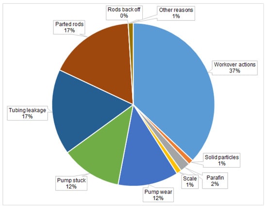 An analysis of downhole pumping equipment failures identified the main reasons for failures in the studied field. The main method of operation in this field is the use of sucker rod pumping equipment, where the rod is a crucial structural element. During the operation of the sucker rod pump, as a result of several factors, premature well failures can occur due to malfunctions in any part of the SRP system. Based on the national company’s “KazMunayGas” 2023 production data from the pilot field located in the Mangystau region of the Republic of Kazakhstan, Figure 2 shows the leading equipment’s failure reasons.