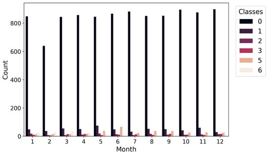 As mentioned before, the authors used data from one oil and gas deposit in Kazakhstan. There are 1068 wells with different types of accidents that impact production. The dataset contains 11,542 rows and 24 features. In Figure 3, the distribution of different types of accidents was presented for the 2023 year. We used the following predictors: workover plan (Geological and technical actions): 1, sucker rod breakage: 2, pump stuck: 3, sucker rod wear: 4, tubing leakage: 5, sucker rod wear: 6. In the current dataset, we did not consider the compositional features of the extracted liquid (mechanical impurities, corrosive activity of the environment) because the composition of the extracted liquid is complicated, and obtaining interesting data is not easy.