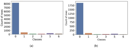 The main dataset was divided into training and testing in the proportion of 80% and 20%, respectively. Figure 4 shows the class distribution for the training and test datasets. The general, training, and test datasets are also unbalanced. Based on this distribution of fault classes, we can see that making correct predictions is a huge challenge for any approach. Therefore, we considered the binary classification task. In other words, we considered two classes: 0—normal work (no fault), and 1—fault. Class 1 is the combination of all classes, such as 1, sucker rod breakage: 2, pump stuck: 3, sucker rod wear: 4, tubing leakage: 5, and sucker rod wear: 6.