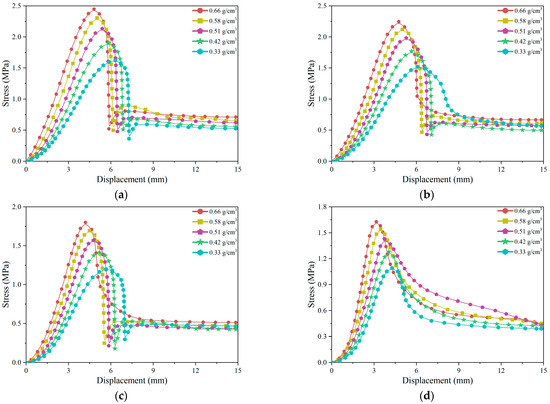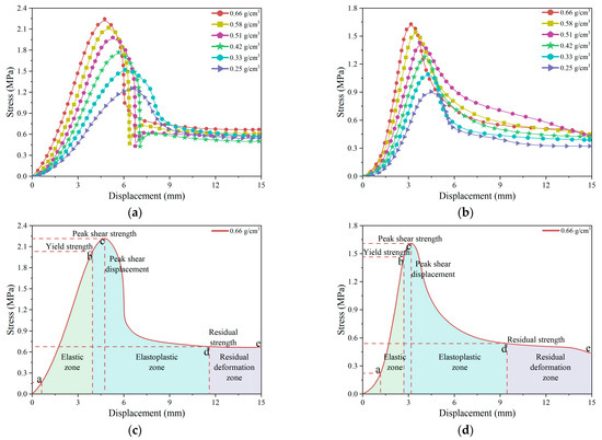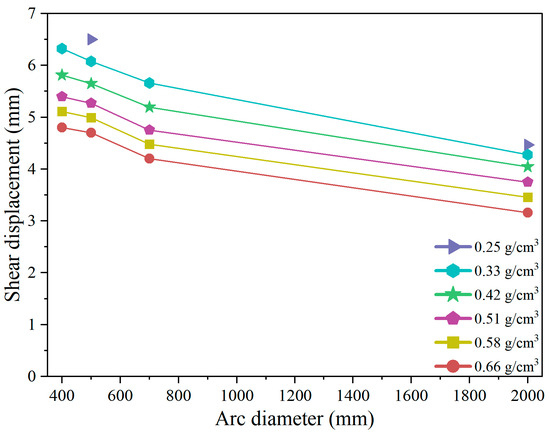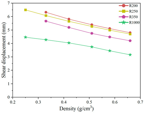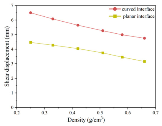 - The shear behavior of the curved composite specimens is significantly higher than that of the planar composite specimens. For curved specimens with a diameter of 500 mm and polyurethane densities of 0.25, 0.33, 0.42, 0.51, 0.58, and 0.66 g/cm3, the shear strength of the curved composite specimens was, respectively, 1.38, 1.39, 1.38, 1.39, 1.37, and 1.38 times greater than that of the planar composite specimens. The shear stress-displacement curves show similar patterns for both curved and planar specimens, but there are notable differences in the fracture failure stage. Shear failure in the curved specimens occurs more abruptly compared to the stable shear failure observed in planar specimens.