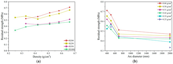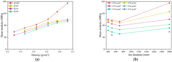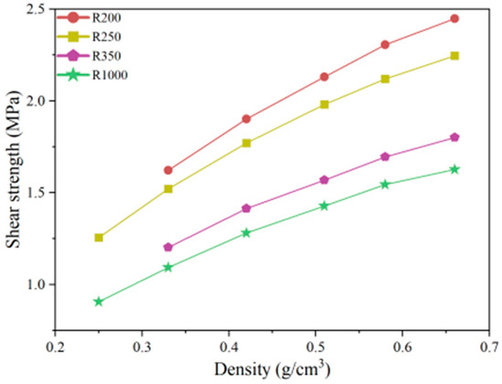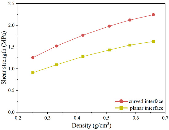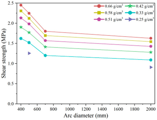 - The shear strength of the curved composite specimens with different diameters follows a similar trend with the polyurethane density. As the arc diameter of the curved composite specimens increases, the shear strength gradually decreases and approaches that of the planar composite specimens.