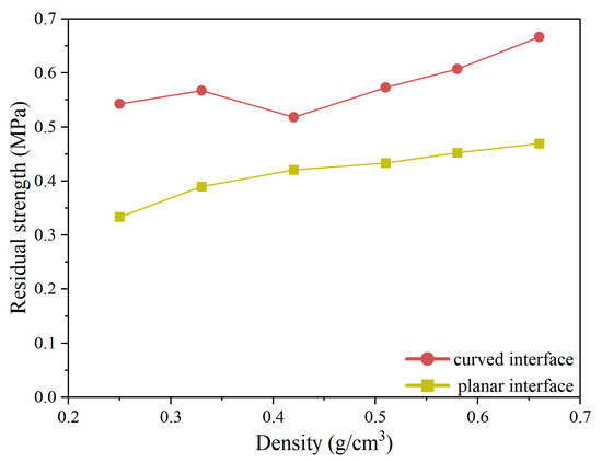 - The shear strength of the curved composite specimens is significantly greater than that of the planar composite specimens. The shear strength of the composite specimens increases gradually with a higher polyurethane density, although the rate of increase diminishes at higher densities. The shear strength of the curved composite specimens with diameters of 400 mm, 500 mm, and 700 mm is approximately 1.50, 1.39, and 1.10 times that of the planar composite specimens, respectively.