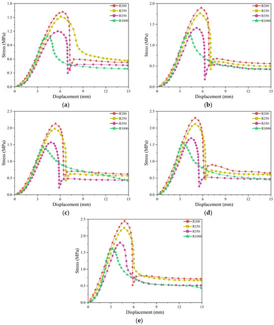 3.2.1. Shear Stress-Displacement Curves of Curved and Planar Specimens with Different Arc Diameters