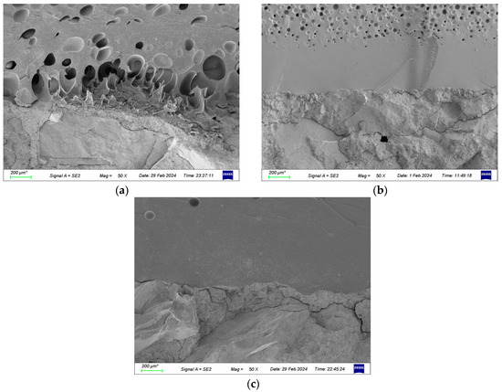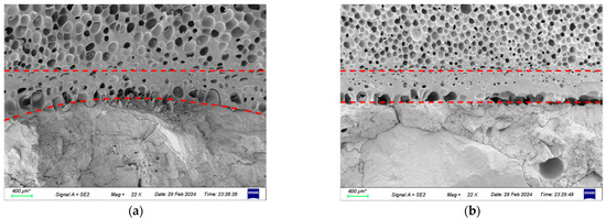 - The distribution of polyurethane foam pore structures differs significantly between curved and planar composite specimens. In the curved composite specimens, the foam structure at the top of the curved interface is more concentrated, with the volume of bubbles decreasing gradually towards the sides of the curved interface. In contrast, the foam structure in the planar composite specimens is uniformly distributed across the plane.