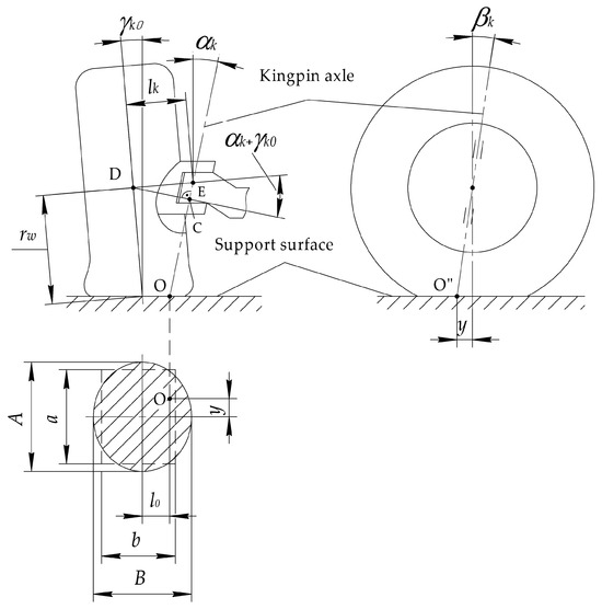 where φ is the equivalent friction coefficient between the tire and the support surface; p (x,y) is the longitudinal pressure distribution of the tire; a and b are the length and width of the tire contact patch, respectively; l0 is the kingpin offset; and x and y are the coordinates of the element of the tire contact patch in the coordinate system, the center of which is located at the kingpin axis–support surface intersection point.