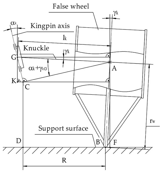 The calculation scheme for determining the kinematics of a rigid false wheel at the kingpin inclination angle is given in Figure 3.