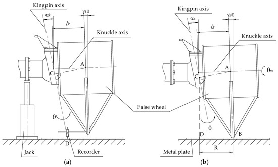 where Rt is the trajectory radius of the relative motion center, m; and θw and θ are the experimental values of wheel rotation angles, respectively, about the knuckle axis and the kingpin axis, rad.