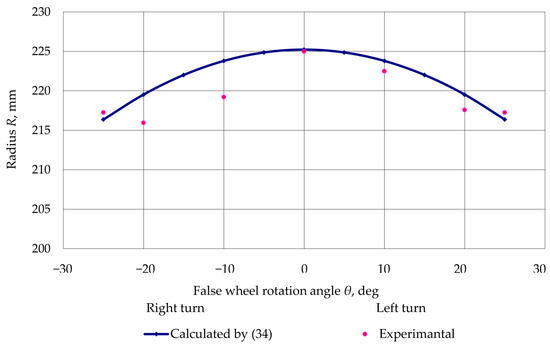 Figure 6 shows the graph of the dependence of the radius of the movement trajectory of the contact point of the rigid false wheel on the rotation angle with a combined kingpin angle, calculated according to dependence (40) (solid curve) and experimentally obtained values of this radius (red dots).