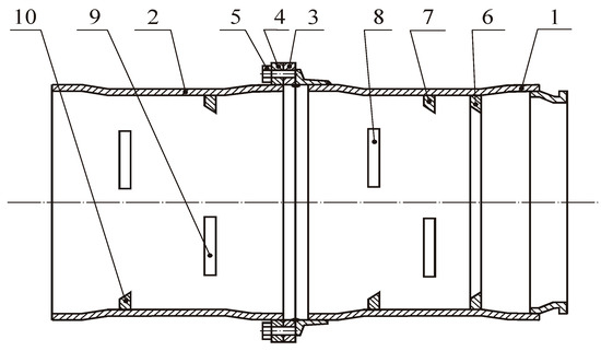 An analysis of Figure 7 shows that the special rim consists of two parts: the main rim 1 and the extension 2. The tire is installed on the main rim. The main rim 1 is a diskless wheel (size 440–533) for a wide-profile tire size 1300 × 530–533 mod. BI–3 with flange 3 welded to the inner landing ring. Extension 2 consists of the base of the rim of a diskless wheel (size 440–533) and flange 4 welded to it. Flanges 3 and 4 are connected to each other with bolts 5. On the main rim and the extension, in addition to the solid landing cone 6, which provides a knuckle length value of 0.225 m when the wheel is installed on the bench, four rows of three evenly spaced landing cones 7, 8, 9, and 10 are additionally welded. These cones facilitate the installation of the steered wheel on the bench to discretely change the knuckle length by values of 0.295, 0.365, 0.68, and 0.82 m, respectively. At the same time, installing the wheel only with the main rim provides a length of 0.225, 0.295, and 0.365 m, and the installation of the main rim with an extension allows the knuckle length values to be increased to 0.68 and 0.82 m.