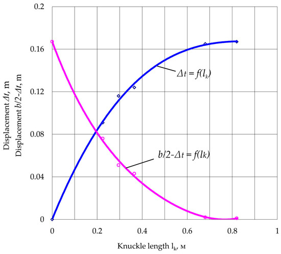 The dependencies of the displacement of the relative motion center of the tire contact relative to its geometric center Δt and the edge of the contact patch (b/2) − Δt on the knuckle length (Figure 8). The experimentally obtained values of Δt and (b/2) − Δt are well approximated by polynomial functions of the third and fourth order, respectively. The processing of these data by means of MS Excel gave the following regression equations: