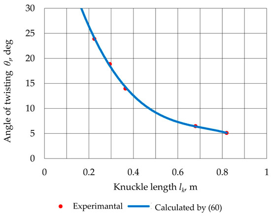 Figure 6 shows that the experimental and calculated data coincide. With the combined kingpin angle, the error does not exceed 3.89% and is within the accuracy of the measurements, which confirms the reliability of the obtained dependencies (40).