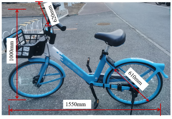 Typical Bicycle: The most prevalent type, the shared dock-less bike, was selected. Adhering to the principle of maximal representation, the largest size of shared bicycle commonly found in China was chosen, featuring a handlebar width of 620 mm, an outer wheel diameter of 610 mm, a total length of 1550 mm, and a handlebar height of 1000 mm from the ground (as depicted in Figure 3). Besides the popularity, another reason for selecting shared dock-less bicycles is their wider handlebars compared to those of privately owned conventional bicycles, rendering them particularly pertinent to bikeway width research. While private sport bikes may also feature wider handlebars, their accessibility to the general public is limited.