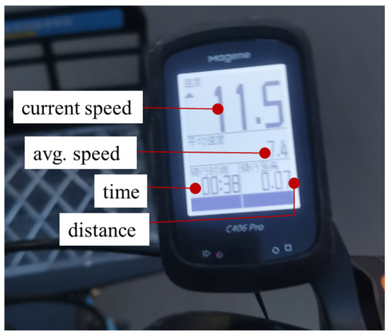 For the acquisition of physiological data, we utilized a Wearable Wireless Dynamic Multi-parameter Physiological Sensor (ECG Sensor with sample rate 2–30 Hz). It is depicted in Figure 4. This device was used to obtain the cycling workload value as stated in the literature [60]. Additionally, a speedometer (illustrated in Figure 5) was employed to monitor and record bicycles’ operational speeds during cycling. This ensured adherence to the required speeds for testing by enabling cyclists to maintain their pedaling rhythm and attain the corresponding speed during the middle section. Supplementary equipment, such as bicycle lane marking belts, were utilized to delineate road edges and establish the designated test widths (Figure 6).