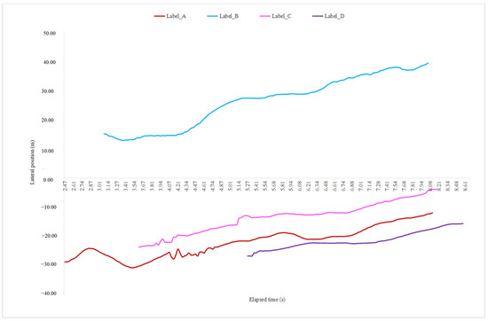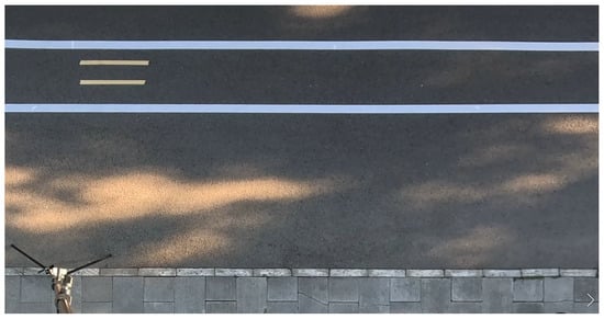 In this context, “lateral distance” refers to the variation between a cyclist’s furthest and closest positions relative to the inner edge of the left lane marking. To eliminate outliers, the analysis focuses on the 95th percentile of the variable Xi, for the maximum lateral position, and the 5th percentile for the minimum, as shown in Figure 9. Based on this approach, the lateral distance can be represented by Equation (2). The lateral position data were captured using the video analysis software Tracker, which tracked four designated points marked with brightly colored labels to ensure precise measurements, as shown in Figure 10. The video sampling process operates at a frequency of 30 Hz, meaning that 30 frames are captured or processed per second.