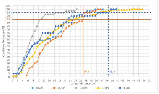 Figure 14 illustrates that under all preset width conditions, the lateral distance required to accommodate 85% of cyclists is 0.268 m. Considering the bicycle width of 0.62 m, the total operation width required is 0.888 m, which is rounded up to 0.90 m. Conversely, the lateral distance required to accommodate 95% of cyclists is 0.365 m. Adding the bicycle width of 0.62 m results in a total requirement of 0.985 m, thus necessitating an operation width of at least 1.0 m to meet these conditions.