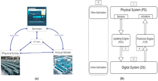 Different models of five-dimensional Digital Twin models, (a) Interaction between physical entity, virtual model, and services via DT data. (b) Digital Twin architecture with physical/digital systems and optimization engines.