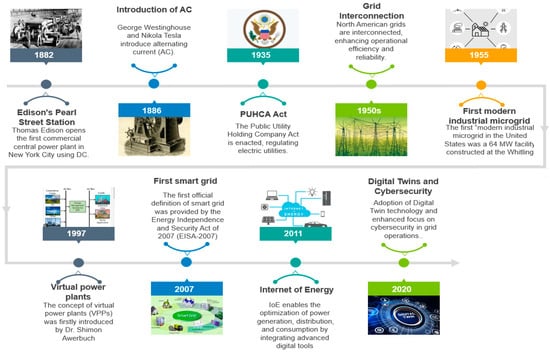The development of the electric grid showcases a long-standing process of innovation and technological advancement. It began with the straightforward direct current (DC) systems that Thomas Edison launched in 1882 at the Pearl Street Station in New York City. This evolution has led to the intricate smart and virtual power systems that we utilize today [65]. Despite DC’s limitations in transmission distance and efficiency, the transition to alternating current (AC) systems, pioneered by Nikola Tesla and George Westinghouse, allowed for more efficient transmission over long distances and set the stage for modern electricity distribution starting in 1886 [66].