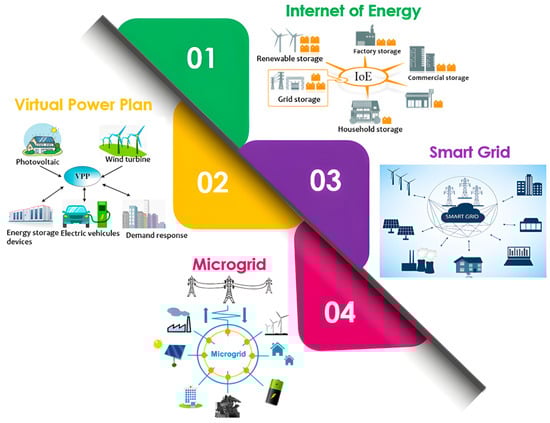 The electric grid constitutes an extensive system that delivers electricity. The electricity generated from multiple sources is distributed to consumers over broad areas, encompassing entire countries. This expansive network facilitates the generation of power from a diverse array of resources and efficiently manages a vast array of prosumers and consumers, even those located at great distances. It provides electricity at a relatively low cost, accommodating both expected and unexpected losses while fulfilling the demand for electricity. The progression of the electric grid has seen several advancements (Figure 6), moving from the conventional electric grid (CEG) to more sophisticated systems such as the smart grid (SG), microgrid (MG), Virtual Power Plant (VPP), and the Internet of Energy, each offering improvements in efficiency, reliability, and adaptability to modern energy needs.