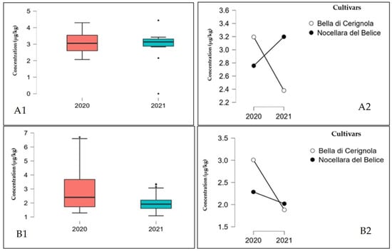 | Nocellara Etnea | <LOQ | 2.49 ± 0.28 | <LOQ | 2.49 ± 0.28 | - | - | - | - | <LOQ |