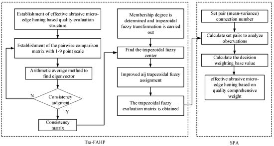 In this study, a combination of Tra-FAHP and SPA was used to evaluate the quality of the Cubic Boron Nitride (CBN) grit micro-edge honing process, and the evaluation process is shown in Figure 1.