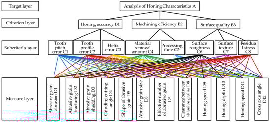 Based on the analysis of the factors affecting the honing process quality and the relationships between the indicators mentioned above, a three-level and a four-level indicator system, as illustrated in Figure 2, has been established to comprehensively evaluate the honing quality.