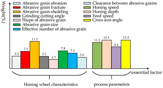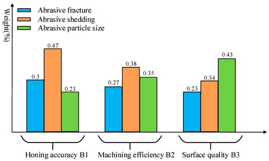 In order to clarify the research objectives, it is first assumed that the importance of criterion layer B will change, followed by the calculation of the trapezoidal fuzzy set for a single criterion. The sensitivity results of key factors are shown in Figure 4. As can be seen from the size of the weighting value, the effect of abrasive grain shedding on honing accuracy and machining efficiency is the most significant, while the effect of abrasive grain size on surface quality is also considerable.