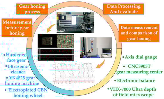 Honing as a gear finishing method, which uses a pair of staggered-axis cylindrical gears for forced meshing into a movement through the honing wheel on the abrasive grains sliding friction workpiece tooth surface, removes a thin layer of material. Some scholars evaluated the quality improvement of gears with grinding wheels from different perspectives. Sandro Pereira da Silva [] established the relationship between five input parameters such as spindle speed, machining time, X- and Z-direction feed rate, and spark out time with total profile deviation (fα), total helix deviation (fβ), and total cumulative pitch deviation (fp) by using a grain swarm algorithm. Yuan Bin [] has optimized and actively controlled the spindle speed, axial feed speed, and radial feed speed of the honing process parameters at a constant cutting speed to minimize the total tooth shape error. The above literature focuses on the effect of various factors on the accuracy of the tooth surface.