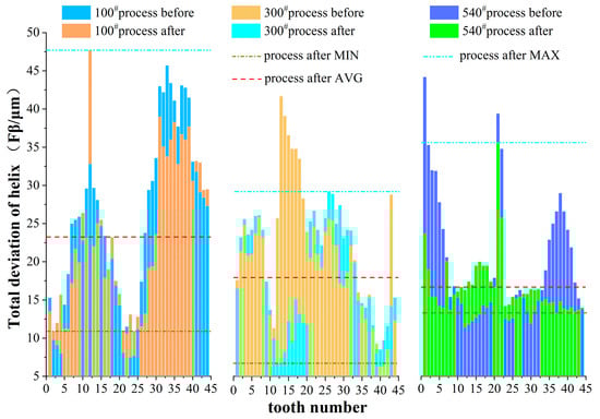 As shown in Figure 6, As the abrasive mesh size increases, the size of the abrasive decreases. After honing, the average value of the spiral deviation of 300# and 540# abrasive particles decreases successively, and the difference between them is very small. The smaller the abrasive grain size, the more concentrated the helical total deviation distribution of the workpiece tooth surface after honing so that the minimum helical error of 540# is smaller than the corresponding value of 300#.