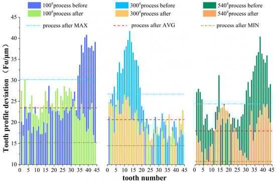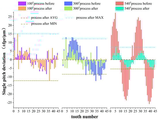 In the electronic gearbox, the workpiece gear and the honing wheel are forced to engage according to the theoretical transmission ratio, which plays a significant role in correcting the pitch deviation. In Figure 7, with the increase in abrasive mesh size, the algebraic difference between the measured tooth pitch and the theoretical tooth pitch decreases progressively. The distribution of pitch deviation is also gradually approaching the zero line, which indicates that the ability to correct the change of common normal length is enhanced, so the machining accuracy of honing teeth is improved. The pitch error of the workpiece shows an obvious sinusoidal distribution after 540# abrasive honing, which reflects the circular run-out error between the honing wheel and the workpiece. It is a random error generated by the previous process. After honing, the pitch error is obviously reduced. Due to error accumulation, the pitch error of the workpiece is still approximately sinusoidal. In the subsequent work, the error recurrence coefficient can be effectively reduced by increasing the number of honing operations.