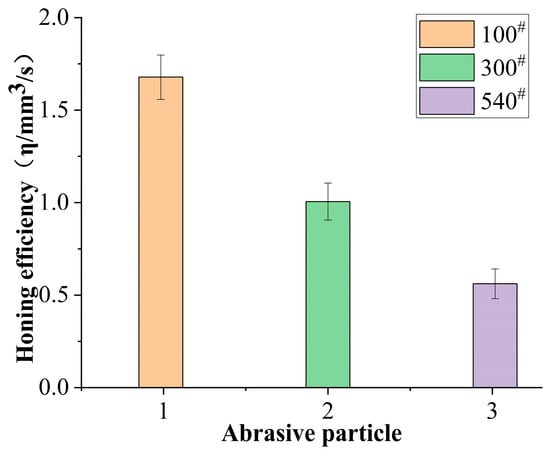 As shown in Figure 10, with the reduction in grain mesh size of the CBN honing wheel, cutting performance and honing processing efficiency are significantly improved. On the one hand, the size of abrasive particles increases with the decrease of grain mesh size. At the same time, the surface width of the abrasive particles and the nominal width of the abrasive chip cutting layer in front of the tool is increased, resulting in more material being cut off from the workpiece surface per unit time, which improves the honing efficiency. On the other hand, when the grain mesh size is small, the contact area between the abrasive particle and the binder is larger, and the height of the abrasive edge is also larger, which makes the chip space and lubricating cooling effect of the honing wheel better, thus enhancing the ability to resist external intrusion. The abrasive particles are less likely to fall off, and the low wear rate of the honing wheel improves the life and processing efficiency of the honing wheel.