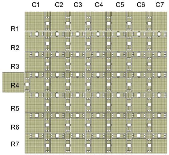 Another big advantage of this structure is that all the components can be fabricated directly on the substrate, power consumption is very low since MEMS are voltage-driven, no current is required for their activation, and they can operate from low frequency up to 100 GHz. The main drawback of the reconfigurable structure is the complexity of the switch control network. The following Figure 3 shows the whole CAD of a matrix structure, with MEMS switches and control pins aimed at activating rows and columns of gold patches. The CAD has been obtained with the professional software Cadence. In the following, we will consider the matrix as a basic structure since it can be combined with similar ones to obtain more complex geometries. The next section will detail a prototype fabrication of a reconfigurable matrix.