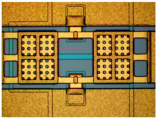 This subsection describes the RF-MEMS switch design and the key components to enable the reconfigurability of the proposed reconfigurable matrix structure. In particular, the following description is a summary for further additional and more detailed considerations about the MEMS design, and characterization can be found in []. The considered switch device is a clamped–clamped structure of ohmic type, driven by an electrostatic actuation mechanism. The series connection between the two interrupted sections of the main RF signal line is obtained by utilizing an ohmic metal-to-metal contact between a movable membrane and the underlying contact pads. Figure 4 reports the MEMS switch fabricated prototype.