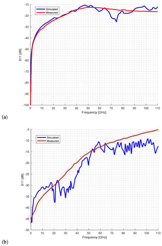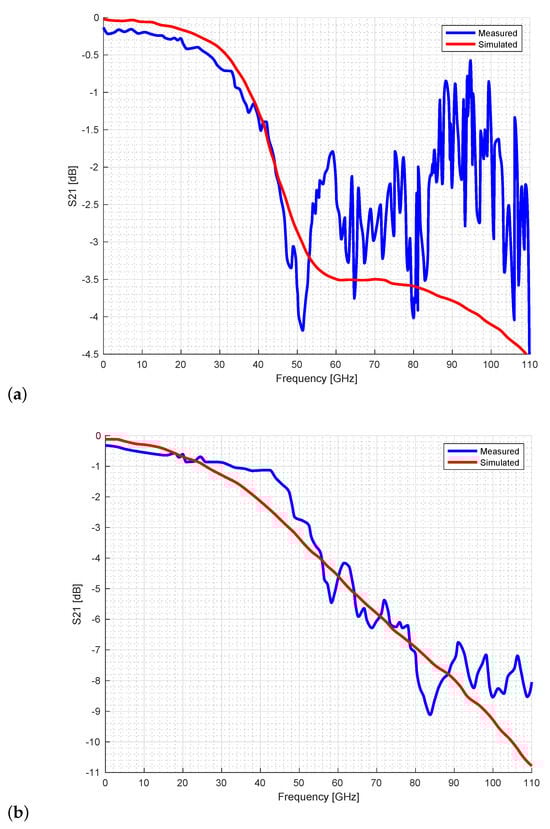 In particular, Figure 5 report the return loss in (a) open (when the membrane is in rest position) and (b) closed (pulled in membrane) conditions, respectively. The insertion loss is reported in Figure 6, also in this case in (a) open and (b) closed switch conditions, respectively. As it can be observed from the data reported in Figure 5 and Figure 6, the agreement between numerical and experimental results is very good. The overall measured return and insertion loss are quite good, especially up to 50 GHz. At higher frequency bands, the performances of such switches are very satisfactory, and they outperform other electronic switches, such as PIN diodes or MOSFET transistors. In light of the considerations and experimental assessment, the RF-MEMS switch proved to be a compact and reliability-oriented device. It provides wideband and remarkable electrical features that make it a suitable building block for the proposed reconfigurable matrix structure.