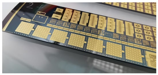 Figure 8 shows a photo of the Si wafer with different prototypes, and Figure 9 reports a high-resolution photo of a single prototype obtained with an optical microscope. The entire dimensions of the prototype are μm2. Each gold patch is μm2, and it is connected with the other surrounding patches by four MEMS switches. On the left side of Figure 9, it can be observed that the gold pad is used as a feeding point for the RF signal. The prototype structure presents a thickness of t = 656.4 μm; specifically, the gold layer has a thickness of =5 μm, the silicon dioxide is characterized by a thickness of = 1.4 μm and a dielectric permittivity of , and the last layer made of silicon has a thickness of = 650 μm and a dielectric permittivity of . A matrix prototype has been cut from the Si wafer and predisposed for the experimental assessment.