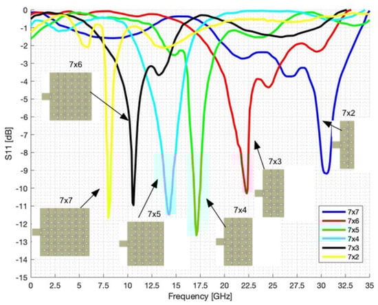 In the second set of numerical experiments, a more complex geometry consisting of a reconfigurable patch antenna has been considered. In these experiments, different columns are activated in order to modify the length and, consequently, the resonant frequency of a rectangular patch antenna, obtaining an electronic reconfigurable antenna able to operate in different frequency bands. The simulations were done with the ADS software, and also, in this case, to simulate realistic scenarios, the disconnected gold patches (with all the surrounding MEMS in an open state) were considered in the simulation. The obtained results are reported in Figure 10. As can be noticed from the data reported in Figure 10, the patch obtained with all the seven columns activated represents a μm2 square patch antenna with a resonance frequency of about GHz as indicated by the yellow curve of Figure 10. Then, as can be observed by reducing the column number from seven to two, the resonance frequency decreases consequently due to the antenna length reduction. The following resonance frequencies, with reference to Figure 10 have been obtained for the different configuration: GHz (black line), GHz (cyan line), GHz (green line), GHz (blue line), and GHz (red line).
