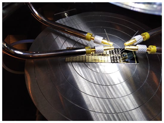 Concerning the scattering parameters, a set of on-wafer measurements has been carried out. The experimental setup is reported in Figure 11. The prototype has been characterized through Ground–Signal–Ground (GSG) probes connected to a Vector Network Analyzer (VNA). A gold ground plane of thickness = 100 μm has been placed below the prototype structure. The first set of measurements aims to measure the impedance of microstrip lines of different widths obtained by activating rows of the matrix as in the first numerical experiment. The goal of this first set of measures is to confirm the simulated data reported in Table 1. The comparisons between numerical and experimental results are summarized in the following Table 2. It can be seen that the measurements are in good agreement with the simulation, and the maximum error is 11.0%. The error is probably due to the measurement procedure that used small needles to connect the prototype sections. However, the results obtained can be considered quite satisfactory.