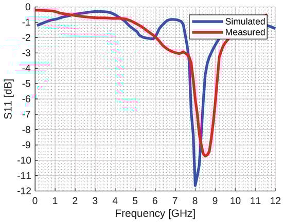 The switch dimensions are quite compact, with an overall reduced physical footprint of μm2. The switch layout reported in Figure 4 consists of an 8-mask surface micro-machining process developed on a 6-inch silicon support, covered by a basic layer of silicon oxide. The silicon oxide is deposited and used on the different layers to isolate them. Then, it is etched and filled with conductive materials, and an electrical connection must be established between adjacent layers. The fabrication procedure is detailed in [,]; more details concerning the different masks will be summarized in the following subsection to describe the reconfigurable matrix prototype. The scattering parameters (S-parameter) of the considered MEMS switch have been numerically and experimentally assessed. In particular, a comparison between simulated results obtained with commercial software, namely Ansys HFSS, and measurements have been performed with a vectorial network analyzer (VNA) on a broad observation range starting from DC up to 110 GHz. In particular, the on-wafer measurement setup, the MEMS switch prototype, has been characterized using Ground–Signal–Ground (GSG) probes connected to a Vector Network Analyzer (VNA).