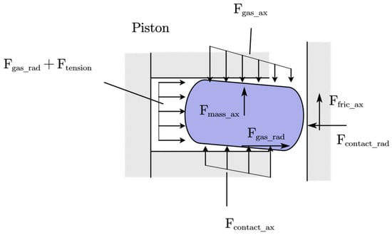 where is the radial component of the contact force between the piston ring and the cylinder liner, is the radial component of the gas pressure force, is the radial friction force between the piston ring and the cylinder liner, is the elastic force of the piston ring.