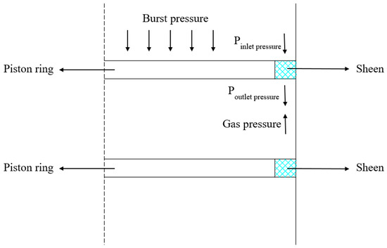 In the calculation, it is assumed that the model operates under rich-oil lubrication, with the starting point of the oil film being on the piston ring side near the top of the cylinder liner and the outlet being on the side of the piston ring farthest from the top of the cylinder liner. Therefore, the oil film pressures at the inlet and outlet are equal to the gas pressures at the two sides of the piston ring, as shown in the Figure 3. The boundary conditions are as follows, in Equations (23) and (24):