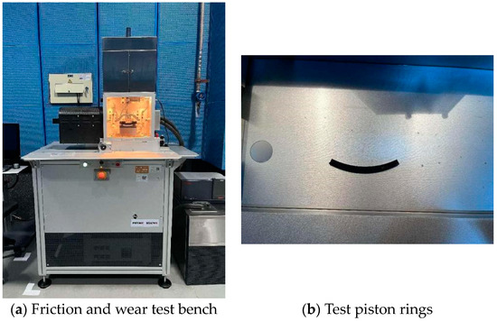 The UMT-2 multifunctional friction and wear testing machine (equipment shown in the Figure 4) was used to test the surface-weaving cylinder liner–piston ring assembly. The test stand is mainly composed of a reciprocating motion mechanism, load loading mechanism, fixture, and other parts; under the reciprocating drive mode of the test machine, the relative sliding speed of the cylinder liner–piston ring is zero in the two stop positions formed, and the relative sliding speed of the cylinder liner–piston ring is maximum in the middle position of the stroke. In the experiment, the piston ring is pressed on the surface of the cylinder liner sample by the normal loading force to simulate the reciprocating motion of the piston ring between the upper and lower stops of the cylinder liner in the actual engine.