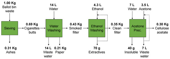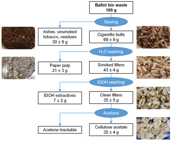 Only a few studies on cellulose acetate valorization have reported the direct use of waste cigarette butts collected in ballot bins as a raw material. In this work, we set up an integrated process, starting with the materials gathered from the smoking areas. Figure 2 reports the purification procedure for the treatment of the ballot bin waste to obtain cellulose acetate. The different steps are highlighted in oval blue, while the different materials along the mass balance are highlighted in rectangular white. The mass balance data reported were the average of five experiments with a 95% confidence interval. Representative pictures are also depicted in the scheme.