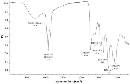 Attenuated total reflectance (ATR) FT-IR measurements were performed using a NICOLET iS5 spectrometer (Thermo Scientific, Waltham, MA, USA) equipped with an iD7 ATR accessory and diamond crystal. All infrared spectra were recorded within the range of 4000–600 cm−1 with a 4 cm−1 resolution and 32 scans. The estimation of the degree of substitution (DS) was performed following the procedure reported by Fei et al., 2017, specifically developed for highly acetylated samples [52].