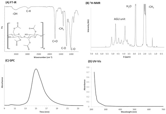 Typical analyses of the final CA recovered. Panel (A): FT-IR; panel (B): 1H-NMR; panel (C): Gel Permeation Chromatography (GPC); and panel (D): UV-Vis. The structure of diacetylcellulose in used as a reference.