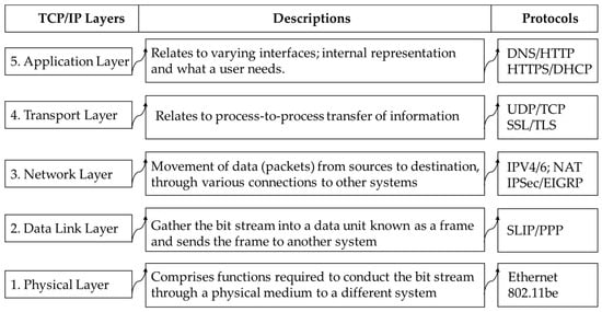 The updated TCP/IP supports communications amongst connected devices across networks to the internet. The TCP/IP model has five layers [23]: the physical layer, data link layer, network layer, transport layer, and application layer (see Figure 1). The layers in this model are responsible for maintaining communication channels, flow control, and reliability assessment via protocols.