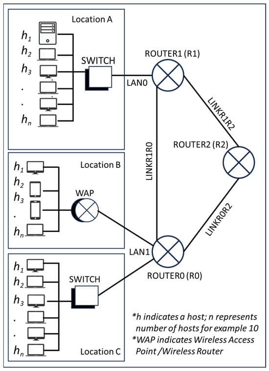 The hierarchical network topology is designed for scalability and optimisation on the performance through TCP/IP layers. This enhances efficiency and resilience in contemporary networks. Figure 3 represents a hierarchical network topology which relates to an ENT with various devices such as routers, switches, servers, laptops, smartphones, tablets, desktop computers, links to the devices, and different locations. The ENT shown in Figure 3 will be discussed in Section 3.