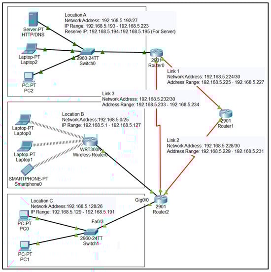 The hierarchical network design [15,16] of our ENT relates to Cisco Architecture Design (CAD) covering wired and wireless hosts such as a DNS/HTTP server, computers, mobile devices, switches, and routers. The ENT design can increase in scalability, redundancy, bandwidth, access layer, and fine-tuning routing protocols. The data and information reach their destination through the routing protocols in the network layer of the TCP/IP model with the assigned single IP address. The strategy for converting the subnet mask will be presented, applied to the ENT designed network, and simulated with Cisco Packet Tracer. To the best of our knowledge, there is no current research that combines VLSM subnetting [17,18], performance, and [19,20] into a boilerplate that can be applicable to the teaching of networking. This work holds great potential as it may be expanded into SCADA systems [21], IoT [22], and the Cloud [22].