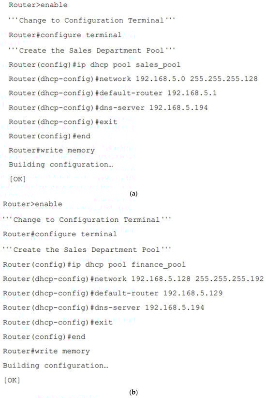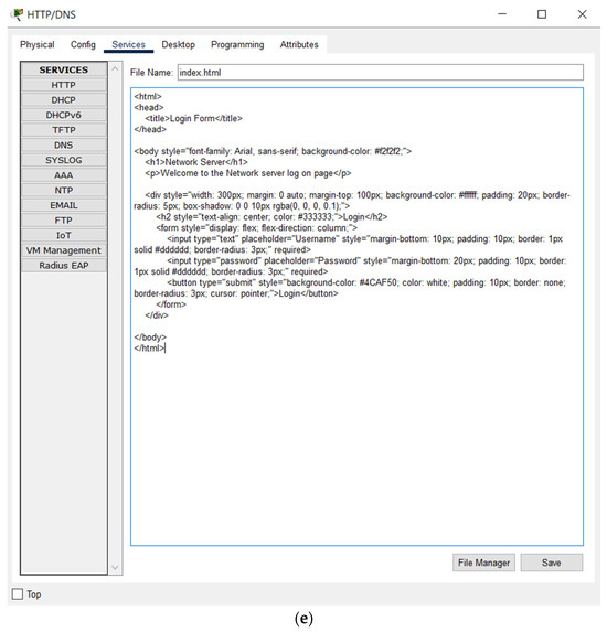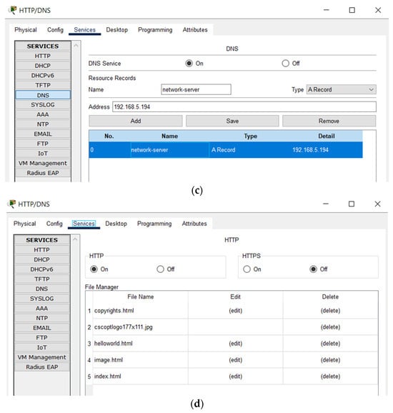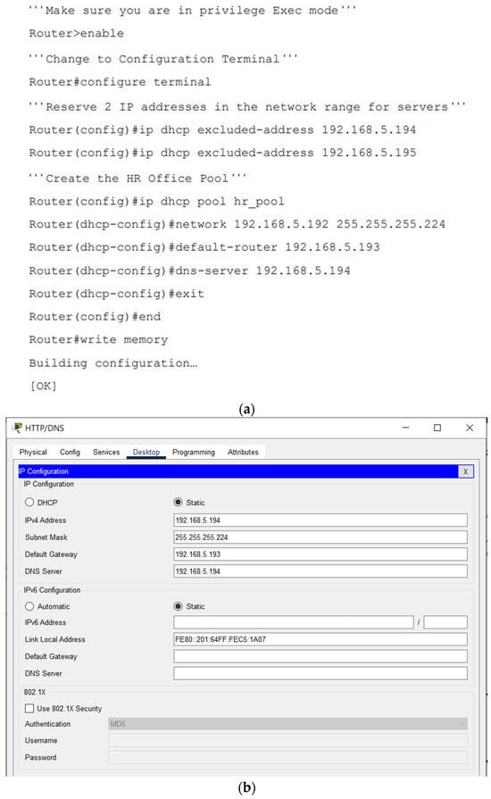 DHCP was configured on the routers Router0 and Router2 to automate the process of IP address assignment within each subnet. This streamlined the network management process by dynamically assigning IP addresses to devices as they joined the network. Manually configuring static IP addresses for each device was avoided because it was time-consuming and error-prone in favour of DHCP which guaranteed an efficient and automated IP address allocation to ensure the network was scalable. With DHCP, the risk of address conflicts was inherently taken care of. Another reason why DHCP was chosen is because DHCP servers can log IP address assignments, making it easier to monitor and audit network usage. The logged IP information can be valuable for tracking device connections, diagnosing issues, and planning for network growth. The DHCP configurations for Locations A, and C are respectively shown in Figure 5 and Figure 6a. The DHCP configurations for Location B are as shown in and Figure 6b and Figure 7. The DHCP configuration of Location A includes the reservation of two IP addresses (192.168.5.194 and 192.168.5.195) to be used for servers. These reserved IP addresses have been assigned manually. The configuration of the Server within Location A is shown in Figure 5b–e. We adopted the convention of using “triple single quotes” for comments. For example, “This is a comment”.