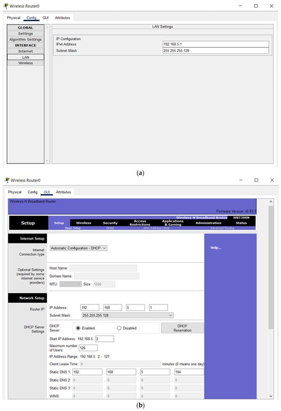(a) Wireless Router Configuration LAN interface. (b) Wireless Router DHCP Configuration.